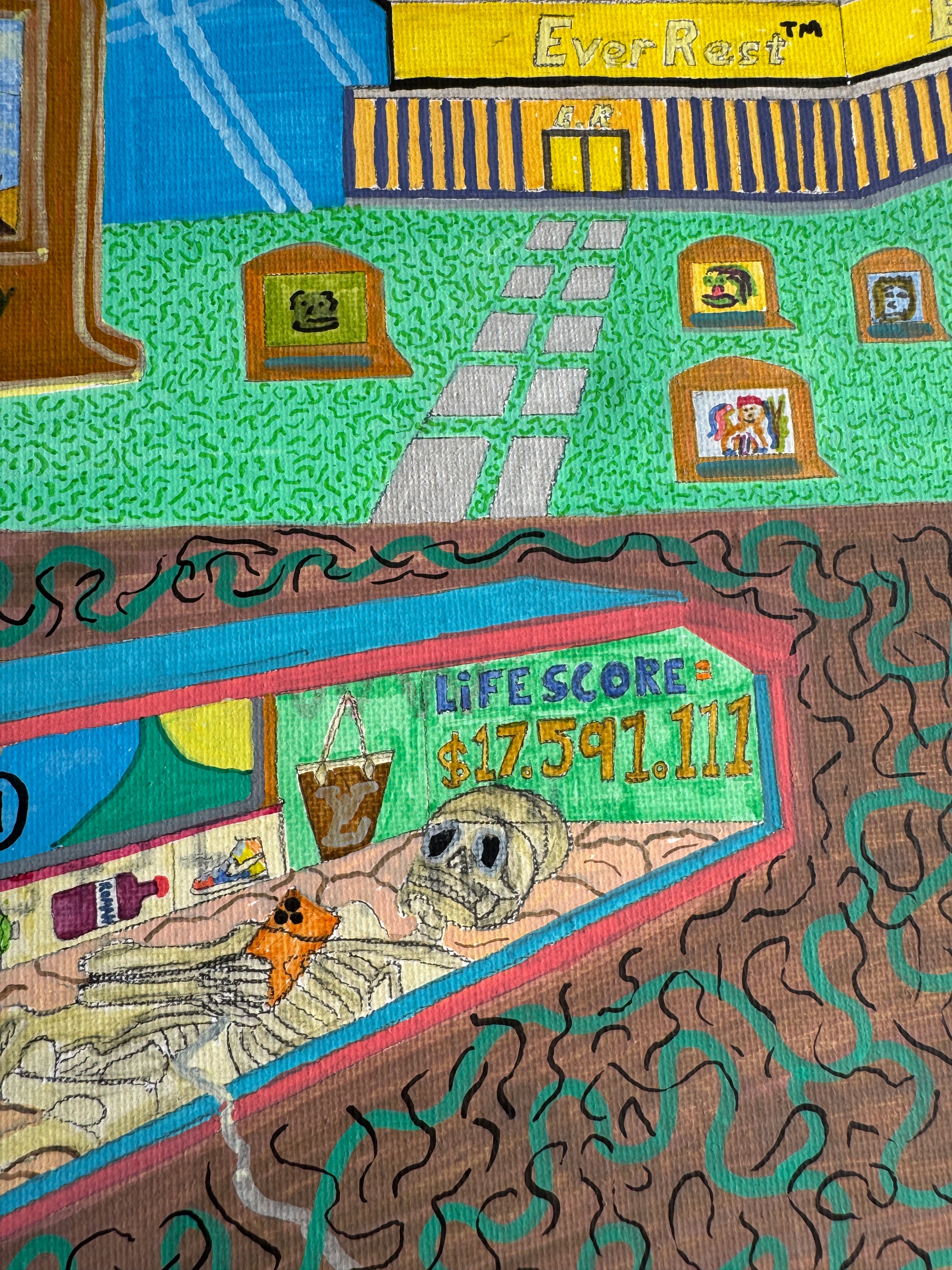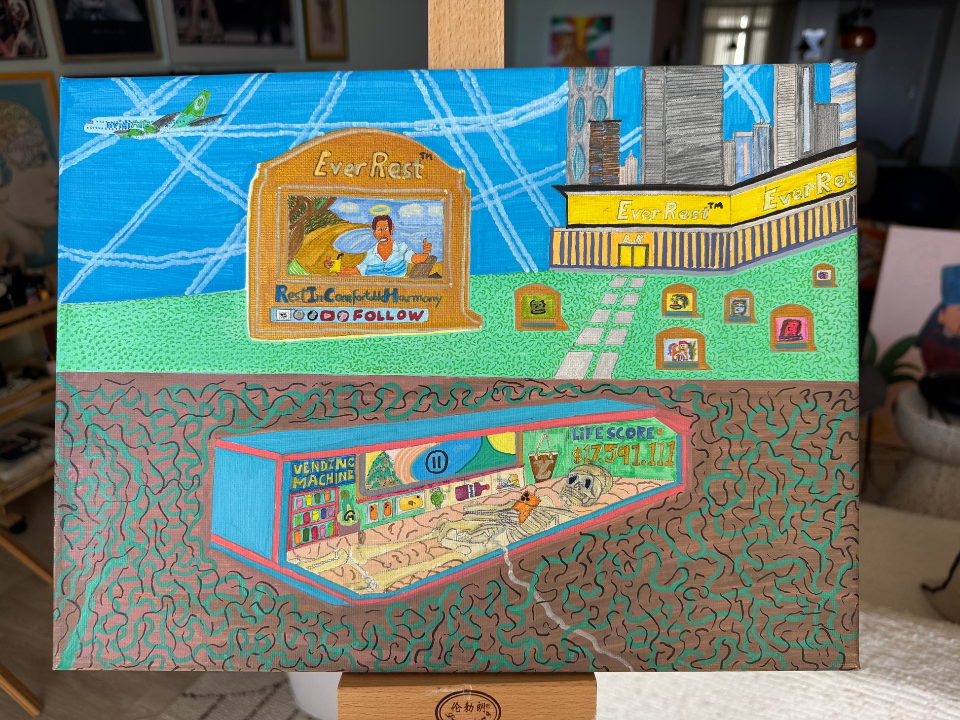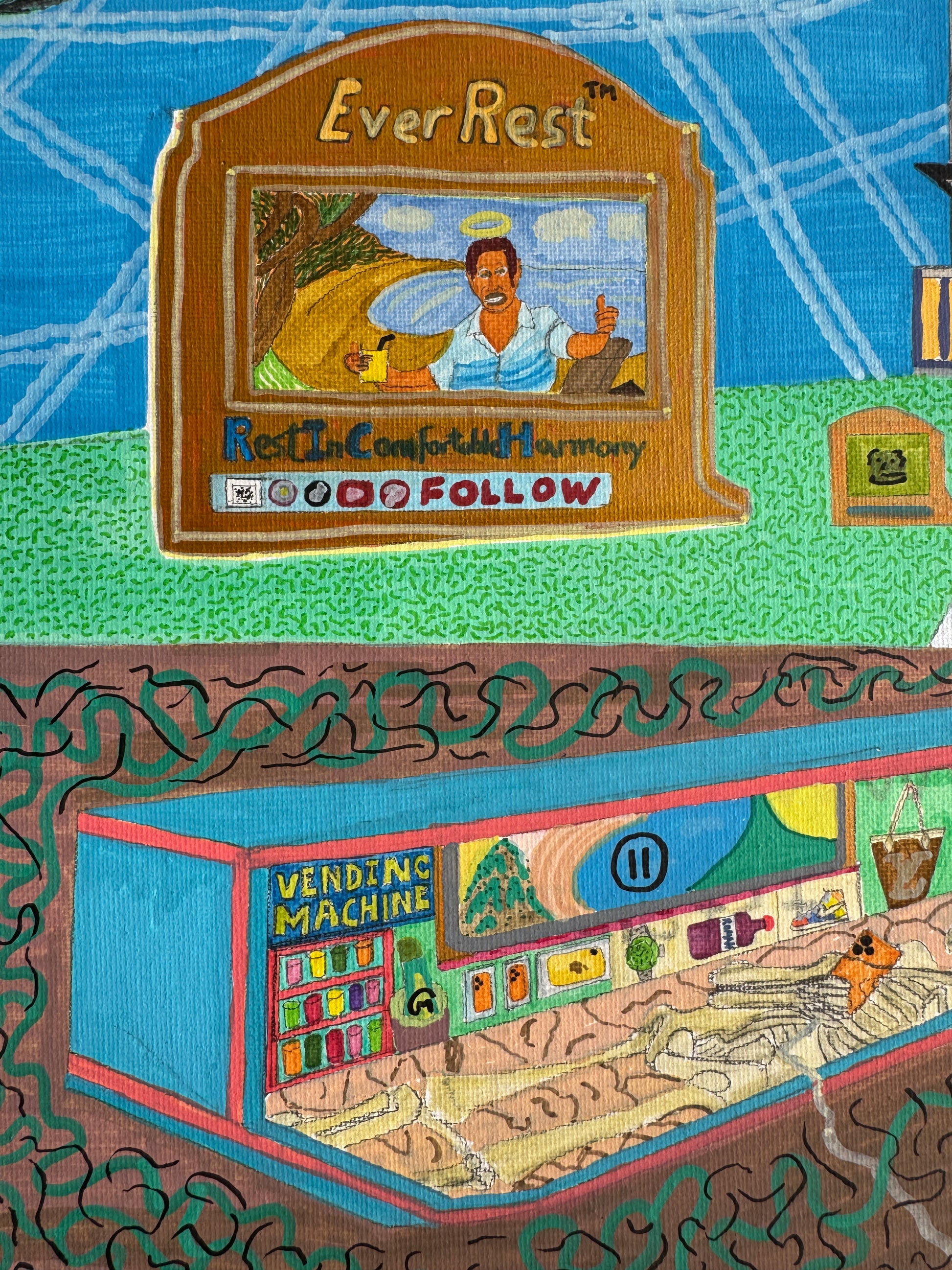 “SmartStone™” is a satirical painting set in a not-so-distant future — where even death has been swallowed by consumer culture.
