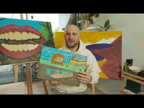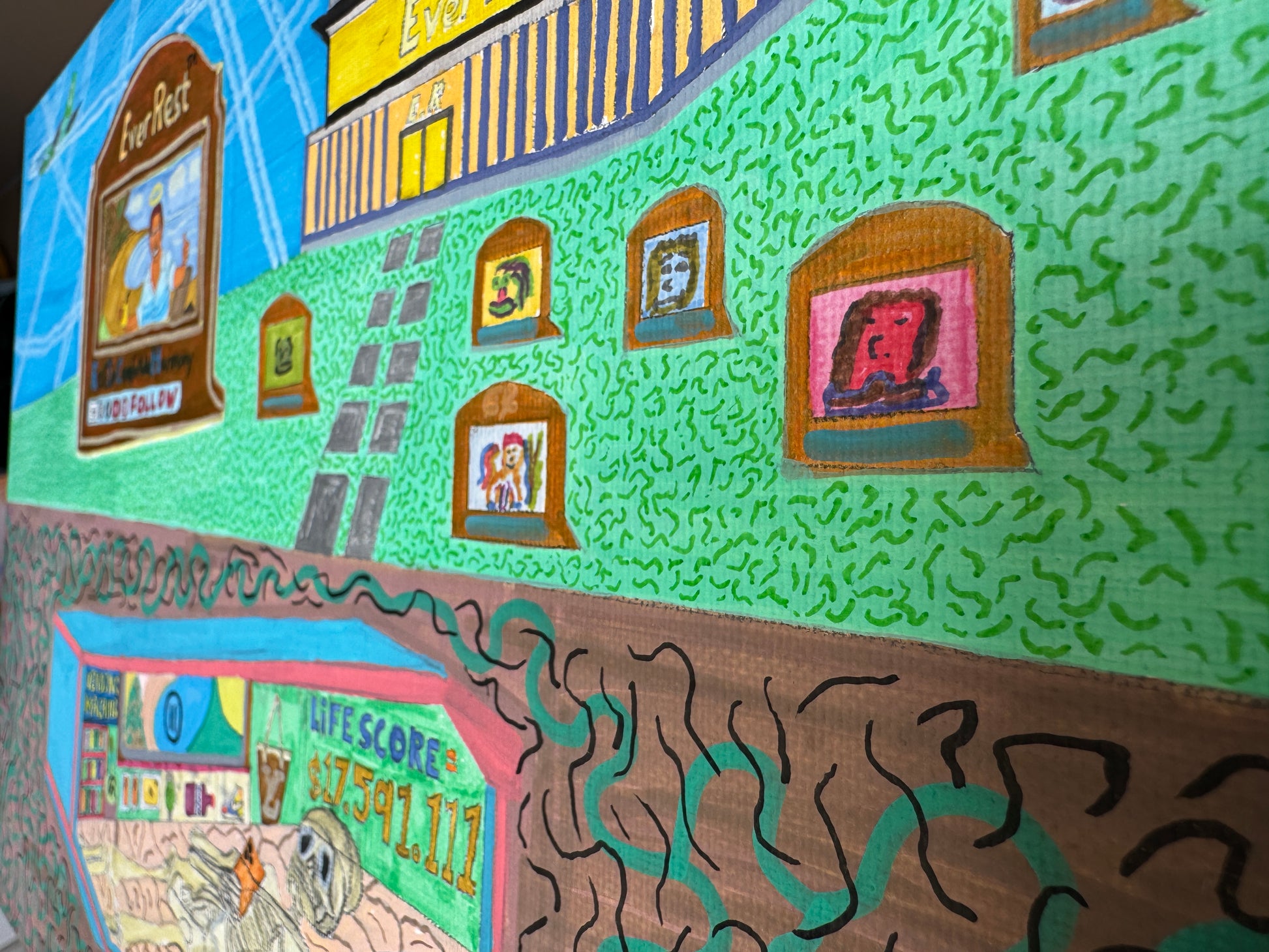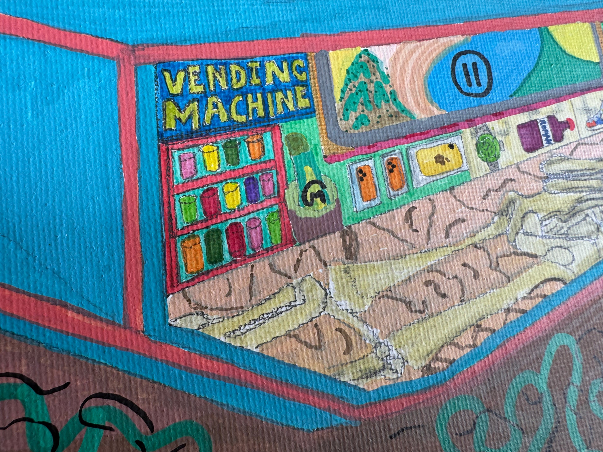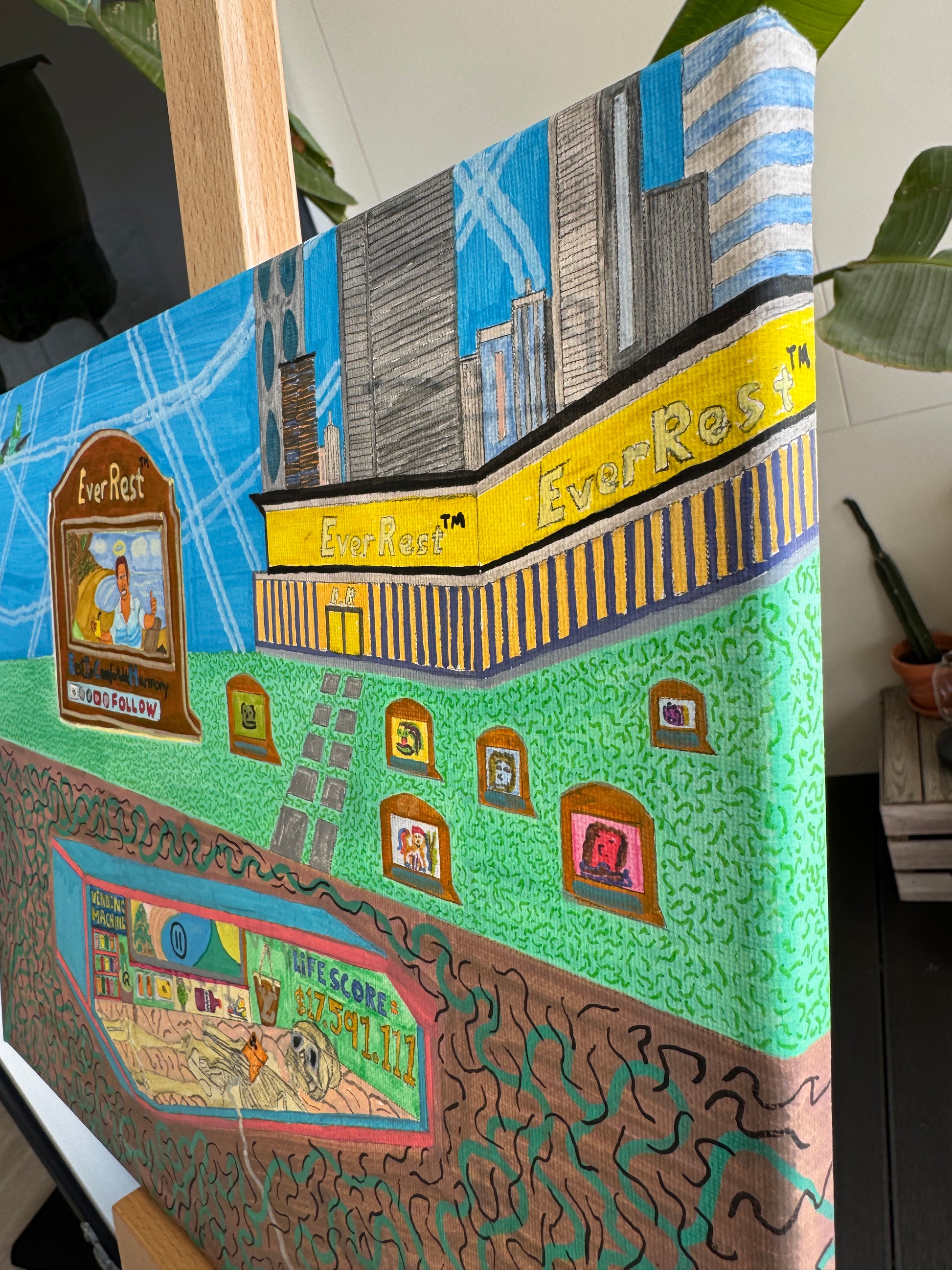 “SmartStone™” is a satirical painting set in a not-so-distant future — where even death has been swallowed by consumer culture.